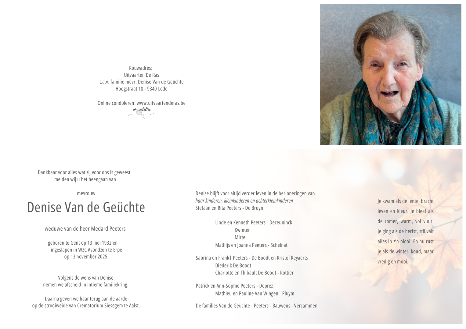 Deze rouwbetuigingsruimte is gewijd aan de herinnering van mevrouw Denise Van de Geüchte. Diegenen die ver weg wonen of niet de mogelijkheid hebben zelf de ceremonie bij te wonen, hebben hier een eenvoudige mogelijkheid om hun sympathie te betuigen aan de getroffen familie.