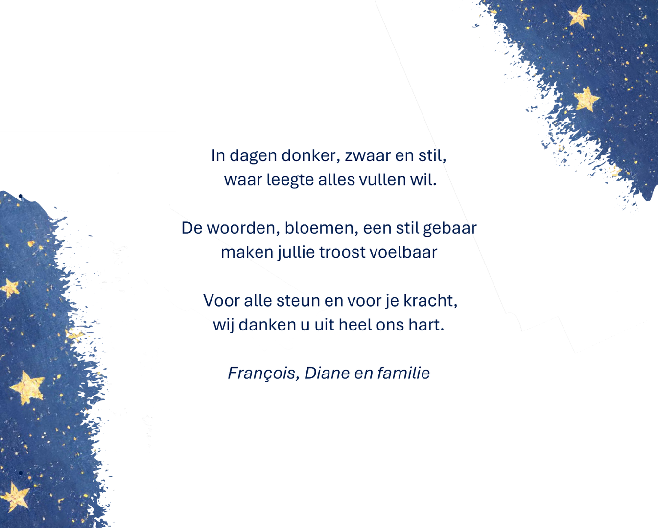 Deze rouwbetuigingsruimte is gewijd aan de herinnering van mijnheer Erik Boone. Diegenen die ver weg wonen of niet de mogelijkheid hebben zelf de ceremonie bij te wonen, hebben hier een eenvoudige mogelijkheid om hun sympathie te betuigen aan de getroffen familie.