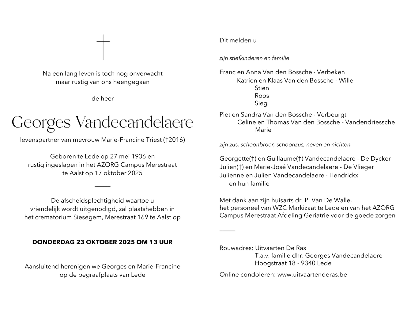 Deze rouwbetuigingsruimte is gewijd aan de herinnering van mijnheer Georges Vandecandelaere. Diegenen die ver weg wonen of niet de mogelijkheid hebben zelf de ceremonie bij te wonen, hebben hier een eenvoudige mogelijkheid om hun sympathie te betuigen aan de getroffen familie.