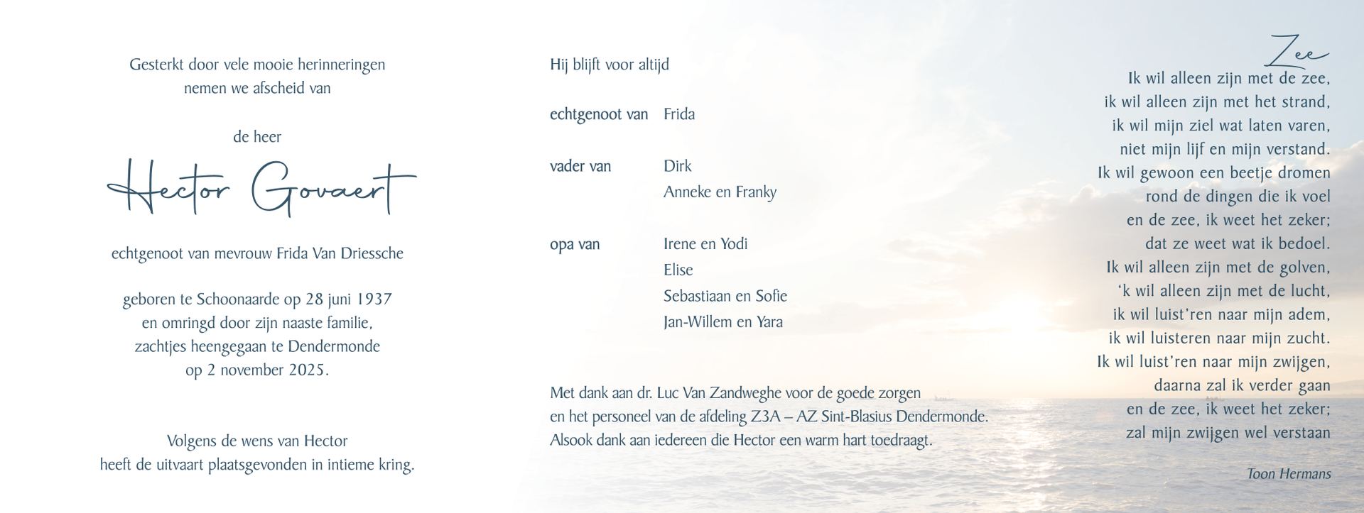 Deze rouwbetuigingsruimte is gewijd aan de herinnering van mijnheer Hector Govaert. Diegenen die ver weg wonen of niet de mogelijkheid hebben zelf de ceremonie bij te wonen, hebben hier een eenvoudige mogelijkheid om hun sympathie te betuigen aan de getroffen familie.