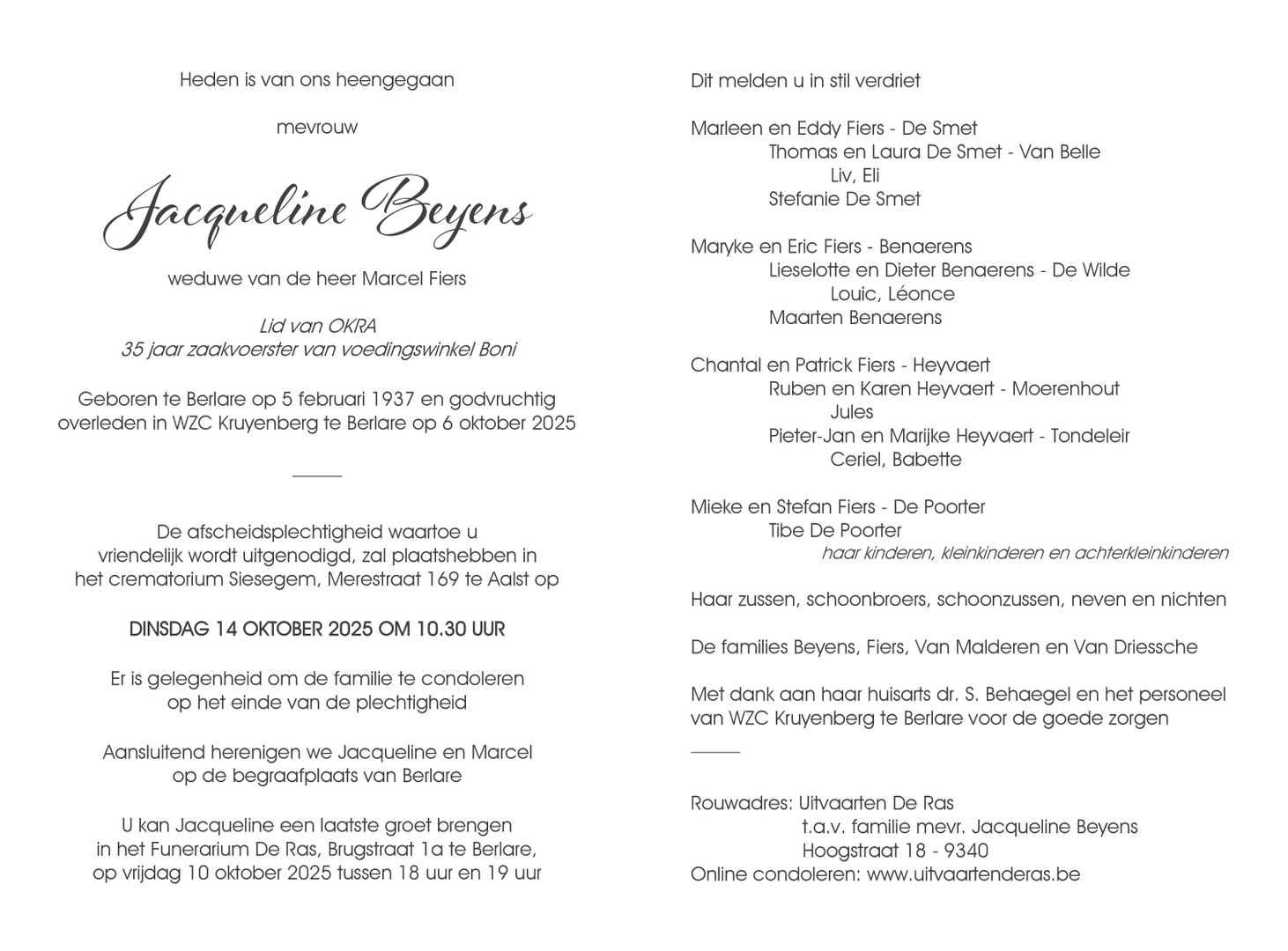 Deze rouwbetuigingsruimte is gewijd aan de herinnering van mevrouw Jacoba Beyens. Diegenen die ver weg wonen of niet de mogelijkheid hebben zelf de ceremonie bij te wonen, hebben hier een eenvoudige mogelijkheid om hun sympathie te betuigen aan de getroffen familie.