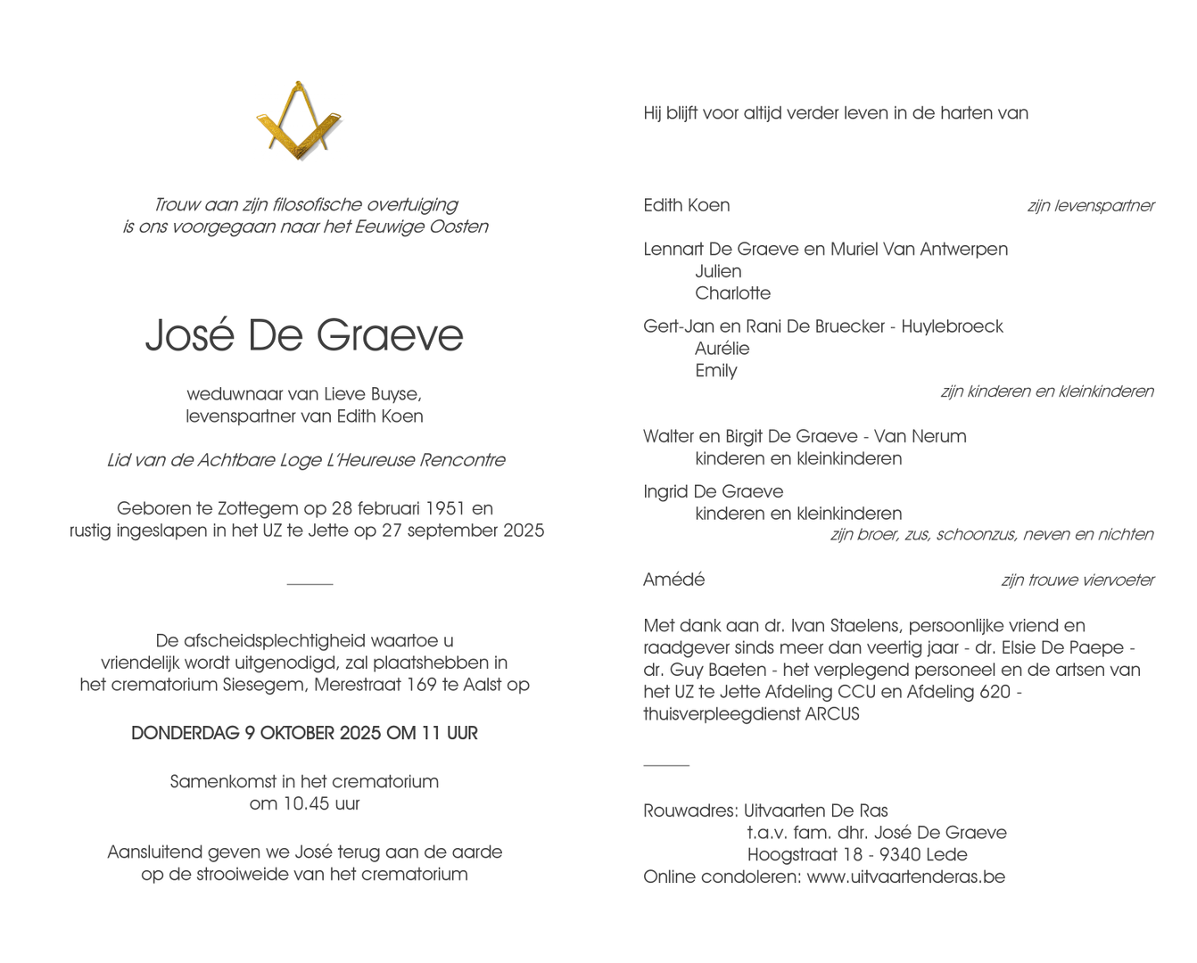 Deze rouwbetuigingsruimte is gewijd aan de herinnering van mijnheer José De Graeve. Diegenen die ver weg wonen of niet de mogelijkheid hebben zelf de ceremonie bij te wonen, hebben hier een eenvoudige mogelijkheid om hun sympathie te betuigen aan de getroffen familie.
