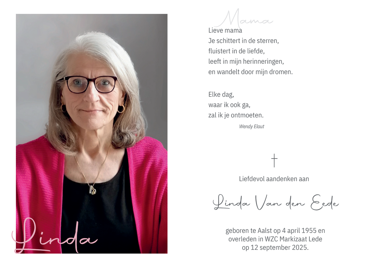 Deze rouwbetuigingsruimte is gewijd aan de herinnering van mevrouw Linda Van den Eede. Diegenen die ver weg wonen of niet de mogelijkheid hebben zelf de ceremonie bij te wonen, hebben hier een eenvoudige mogelijkheid om hun sympathie te betuigen aan de getroffen familie.