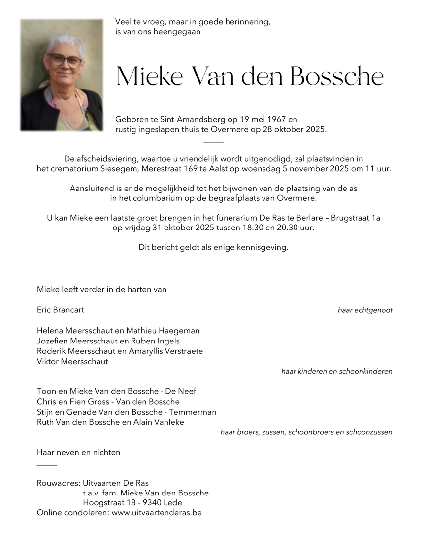 Deze rouwbetuigingsruimte is gewijd aan de herinnering van mevrouw Mieke Van den Bossche. Diegenen die ver weg wonen of niet de mogelijkheid hebben zelf de ceremonie bij te wonen, hebben hier een eenvoudige mogelijkheid om hun sympathie te betuigen aan de getroffen familie.