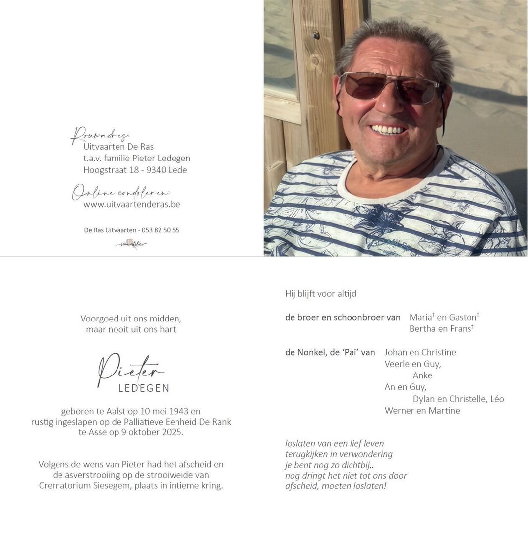 Deze rouwbetuigingsruimte is gewijd aan de herinnering van mijnheer Pieter Ledegen. Diegenen die ver weg wonen of niet de mogelijkheid hebben zelf de ceremonie bij te wonen, hebben hier een eenvoudige mogelijkheid om hun sympathie te betuigen aan de getroffen familie.