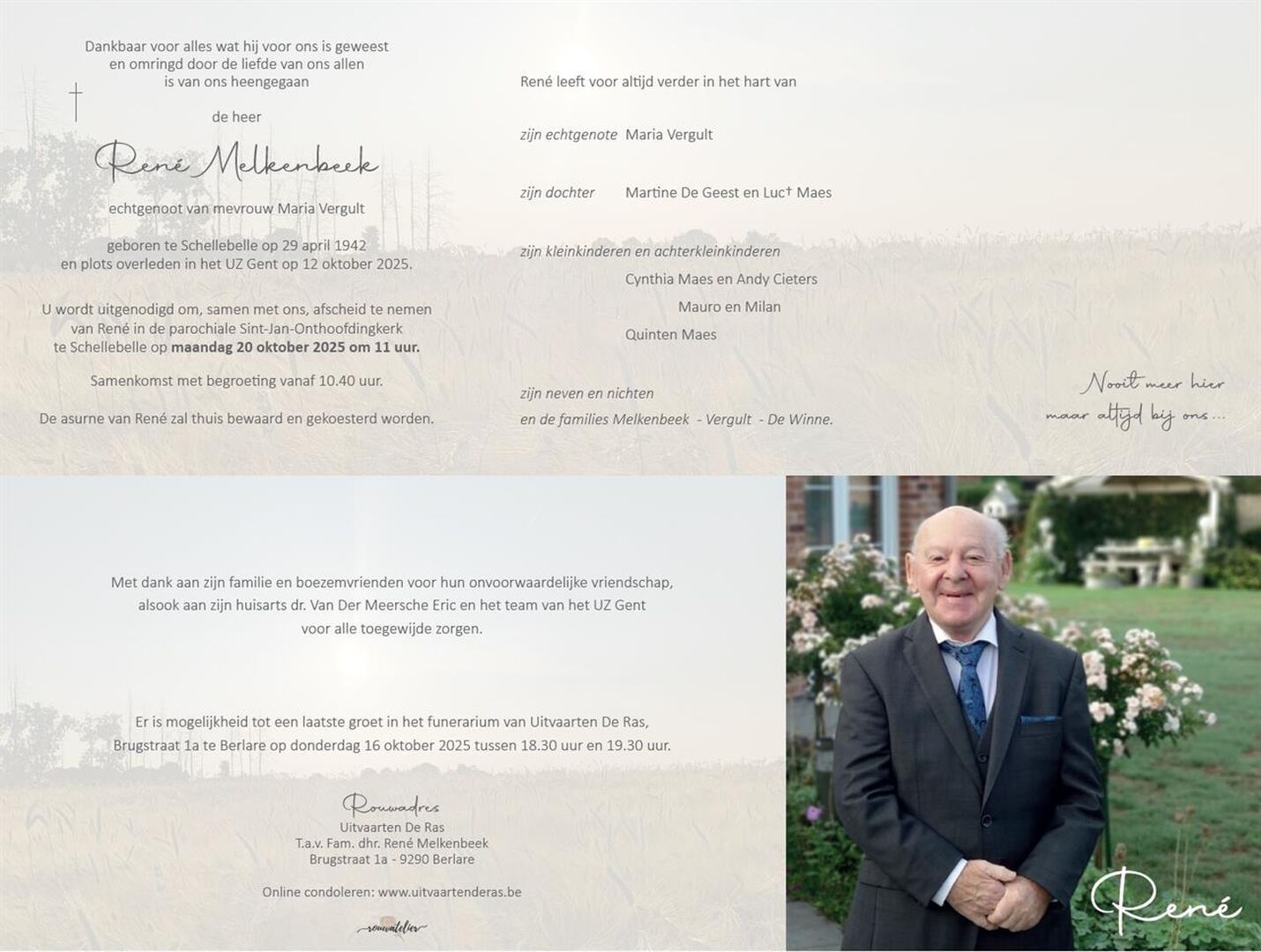 Deze rouwbetuigingsruimte is gewijd aan de herinnering van mijnheer René Melkenbeek. Diegenen die ver weg wonen of niet de mogelijkheid hebben zelf de ceremonie bij te wonen, hebben hier een eenvoudige mogelijkheid om hun sympathie te betuigen aan de getroffen familie.