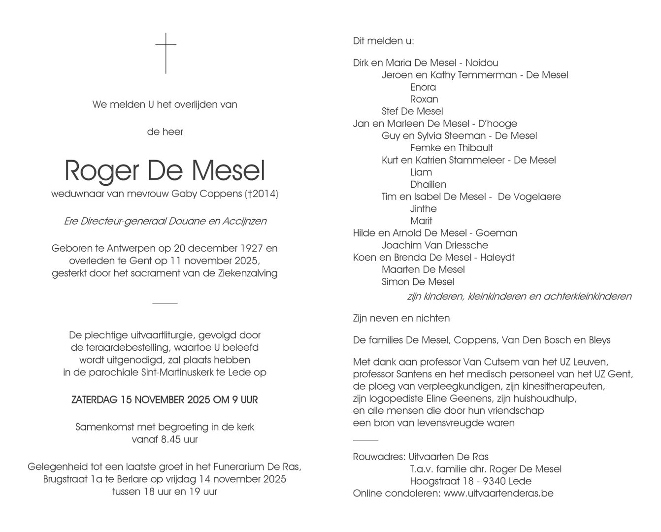 Deze rouwbetuigingsruimte is gewijd aan de herinnering van mijnheer Roger De Mesel. Diegenen die ver weg wonen of niet de mogelijkheid hebben zelf de ceremonie bij te wonen, hebben hier een eenvoudige mogelijkheid om hun sympathie te betuigen aan de getroffen familie.