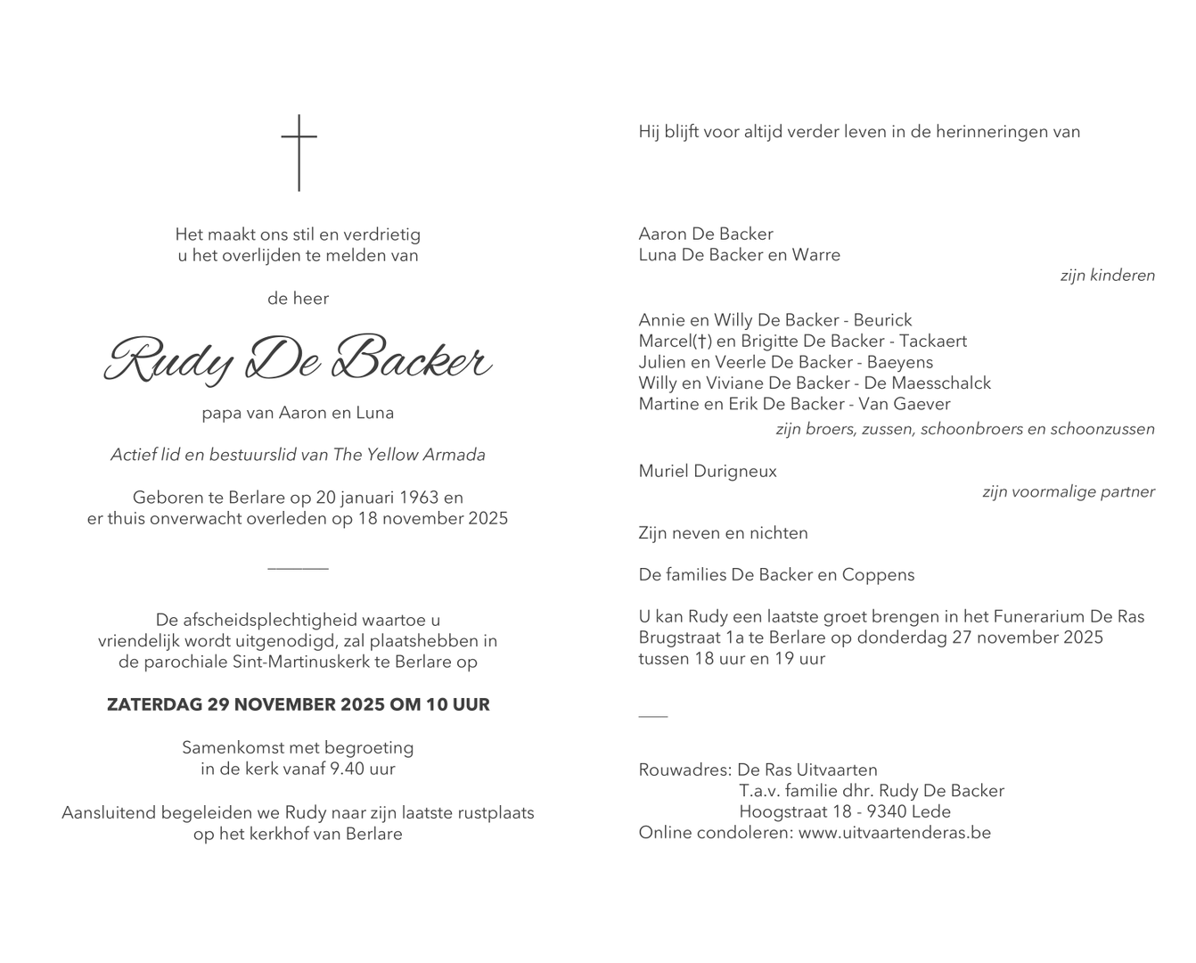 Deze rouwbetuigingsruimte is gewijd aan de herinnering van mijnheer Rudy De Backer. Diegenen die ver weg wonen of niet de mogelijkheid hebben zelf de ceremonie bij te wonen, hebben hier een eenvoudige mogelijkheid om hun sympathie te betuigen aan de getroffen familie.