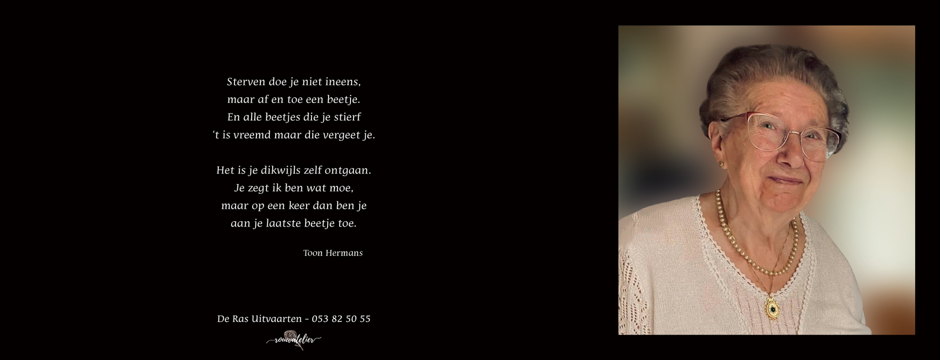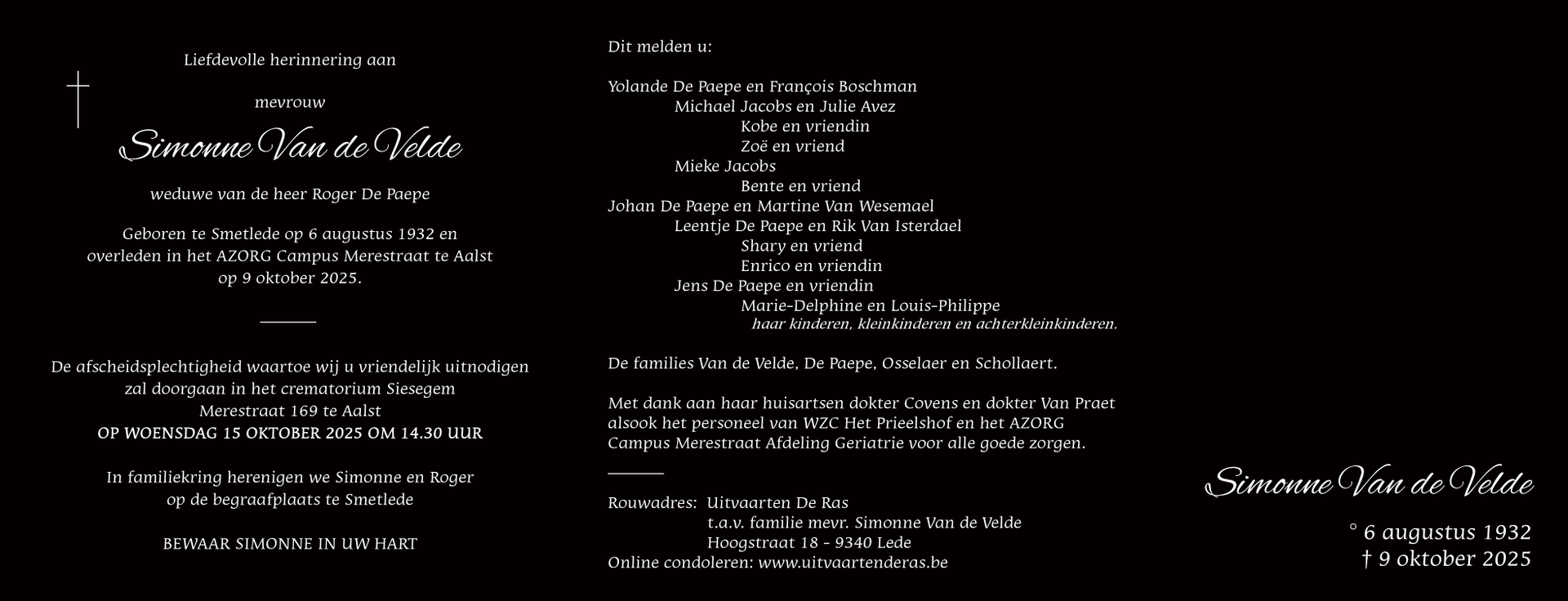 Deze rouwbetuigingsruimte is gewijd aan de herinnering van mevrouw Simonne Van de Velde. Diegenen die ver weg wonen of niet de mogelijkheid hebben zelf de ceremonie bij te wonen, hebben hier een eenvoudige mogelijkheid om hun sympathie te betuigen aan de getroffen familie.